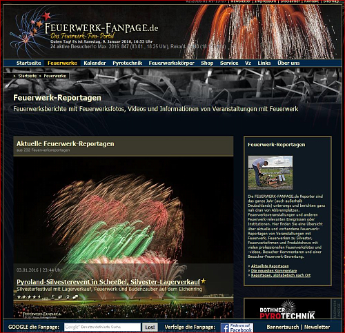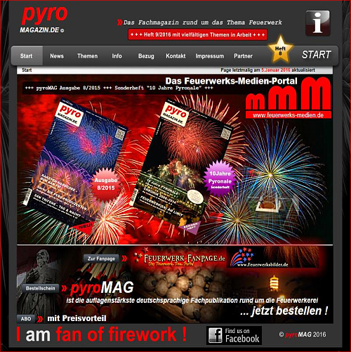 ErlebenSie die Faszination “Feuerwerk” mit dem größten deutschen Feuerwerks-Medien-Portal. Durch Zusammenschluss der Spezialisten aus dem Bereich Foto, Video, Internet & Printmedien gibt es nunmehr seit 2012 die geballte Kraft der Feuerwerks-Medien aus nur einer einzigen Hand. Nutzen auch Sie das für Ihren Event!